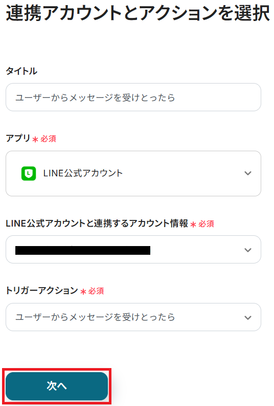 タイトルと連携するアカウント情報を任意で設定し、トリガーアクションはテンプレート通りに「ユーザーからメッセージを受けとったら」のまま「次へ」をクリックします。