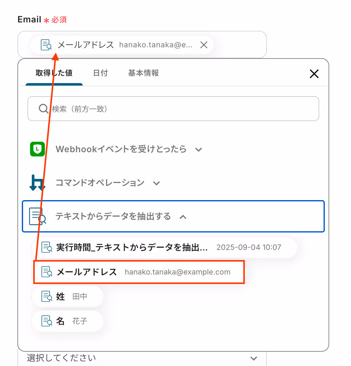 こちらも同じく入力欄をクリックすると取得した値が表示されるので、選択して入力してください。