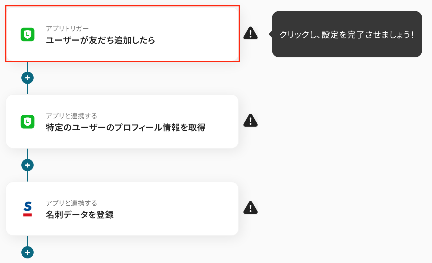 ここからは、「LINE公式アカウントでユーザーが友だち追加したら、Sansanに追加する」フローの設定をします。以下の赤枠をクリックしましょう!