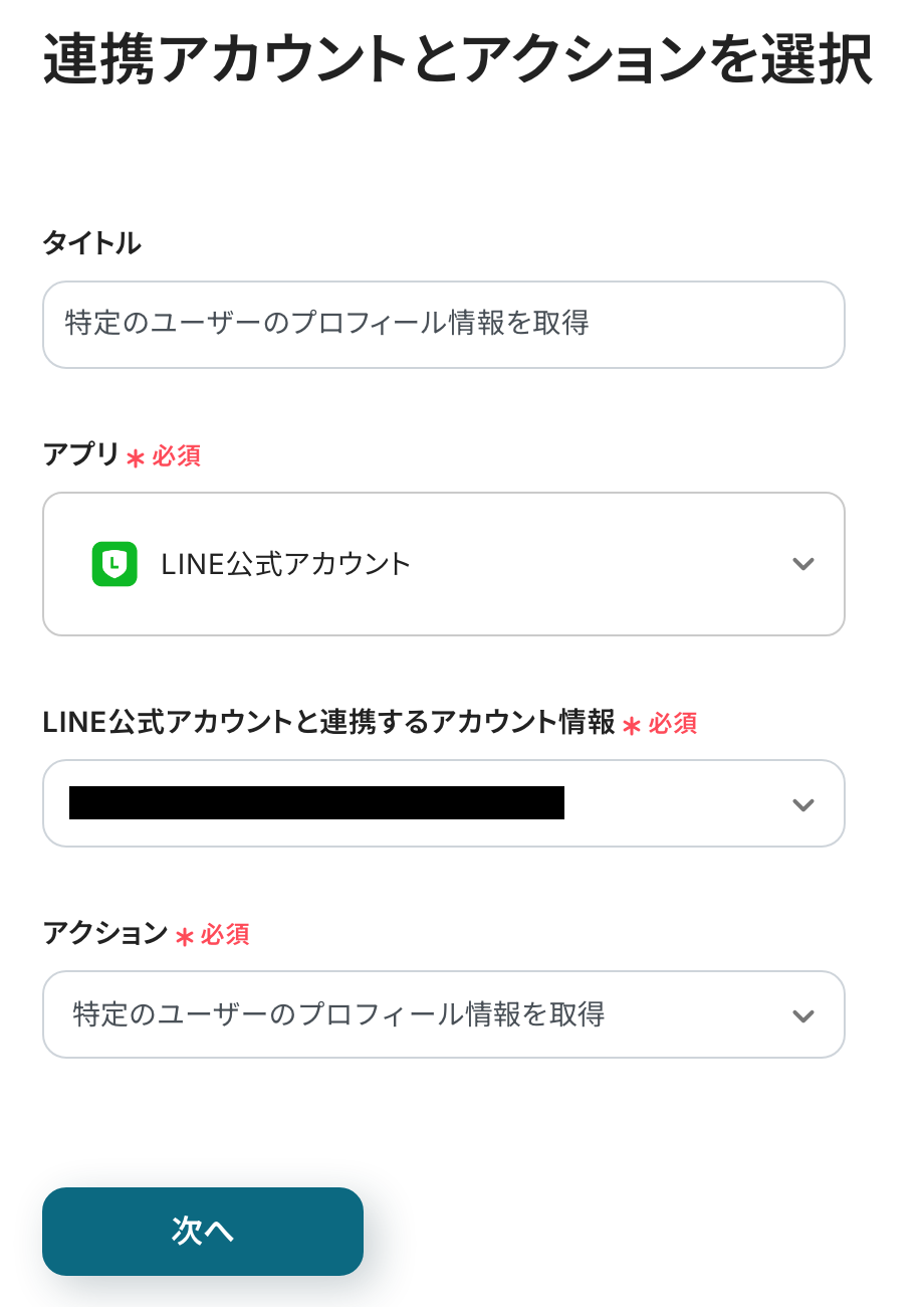- アクション:「特定のユーザのプロフィール情報を取得」を選択