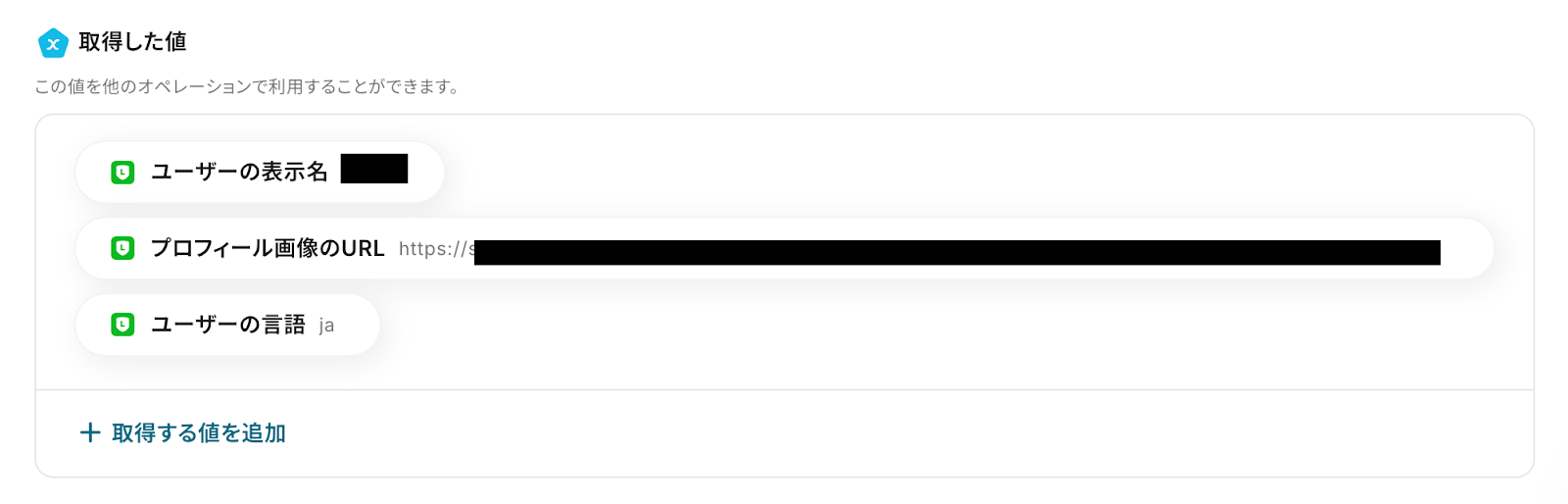 各項目を、入力欄をクリックして表示されるアウトプット(取得した値)から、適切な値を選択していきましょう。