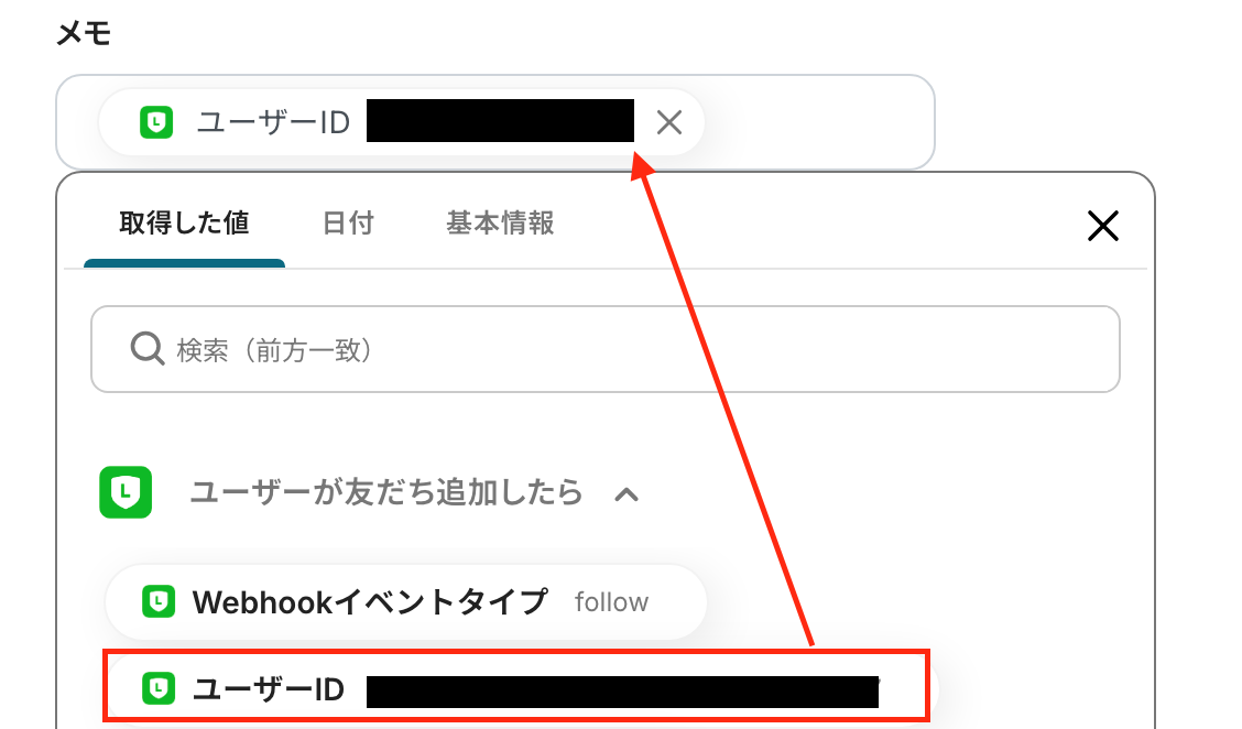 次の画面で「ユーザーID」を入力します。入力欄をクリックして表示される「取得した値」を引用して設定してください。