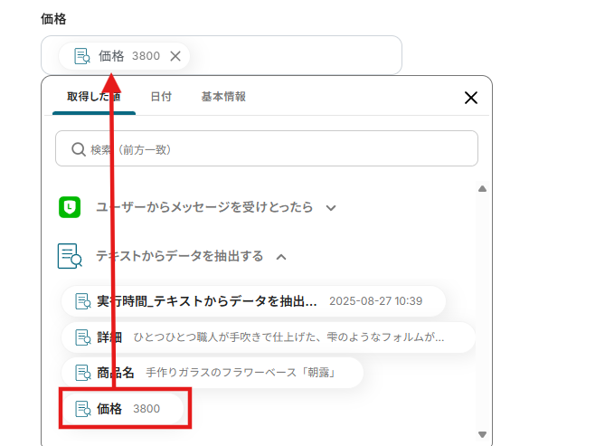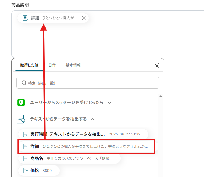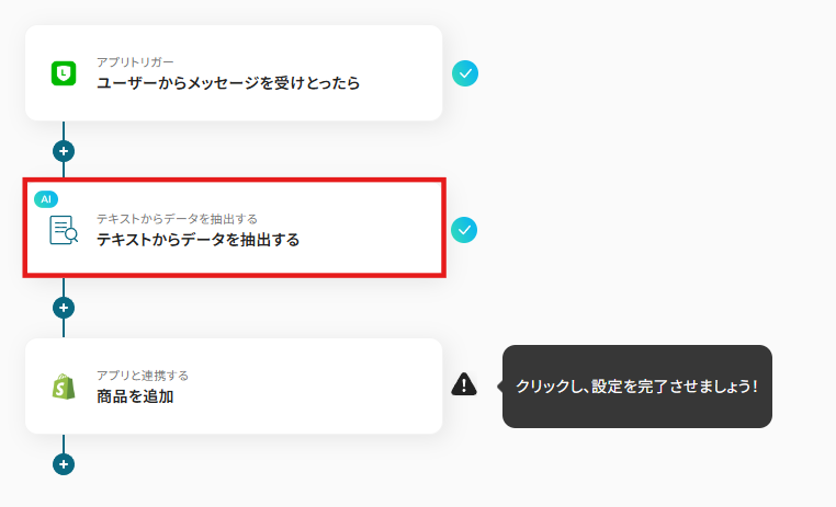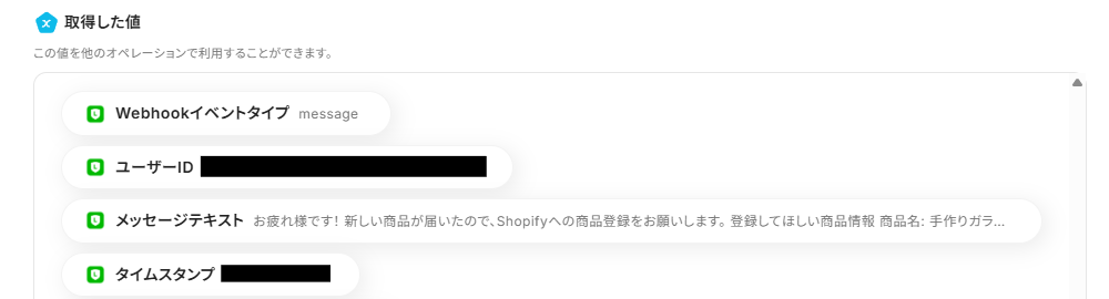 Shopifyで商品情報を作成するため、LINE公式アカウントで受信したメッセージ内容から必要事項を抽出するための設定を行います。