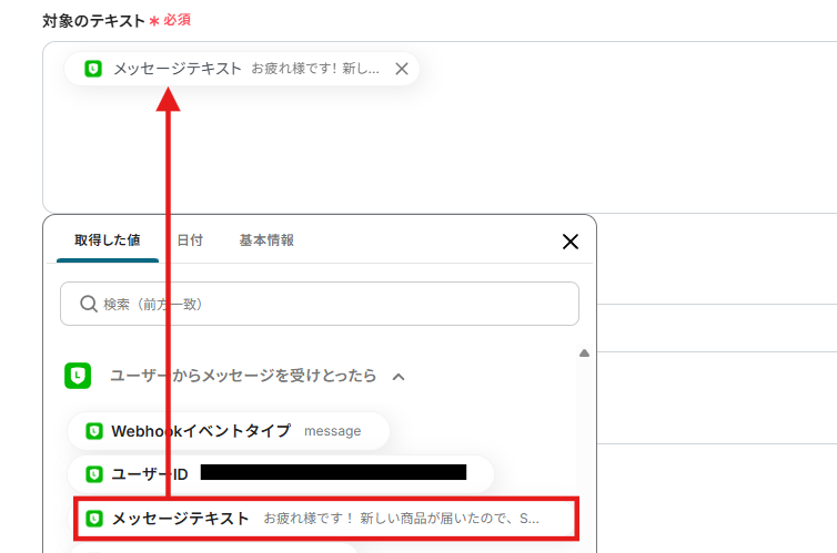 対象のテキストには以下のように、LINE公式アカウントから取得した値より「メッセージテキスト」を選択しましょう。