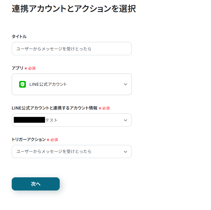 連携アカウントとアクションを選択する画面が表示されるので、今回連携するLINE公式アカウントのアカウントを確認し「次へ」をクリックします。