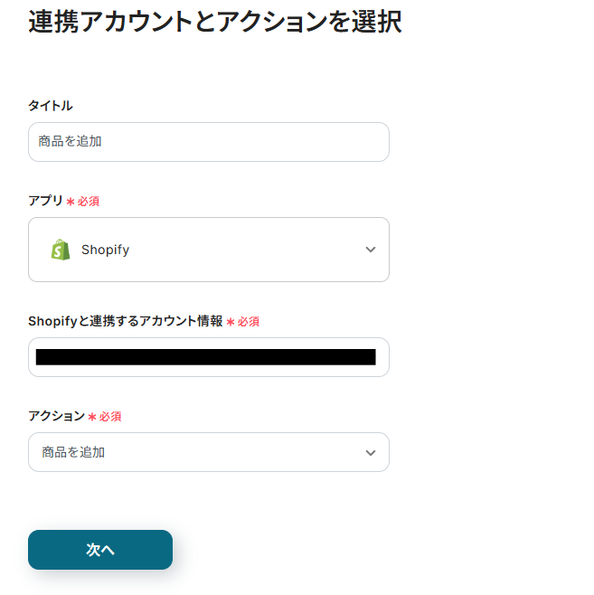 連携アカウントとアクションを選択する画面が表示されるので、今回連携するShopifyのアカウントを確認し「次へ」をクリックします。