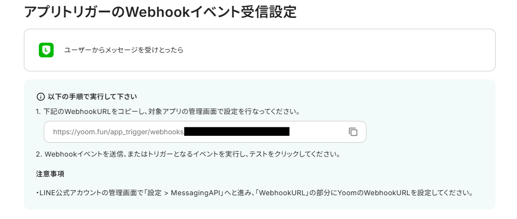 LINE公式アカウントでメッセージを受け取ったことを自動化のトリガーにするための設定を行います。