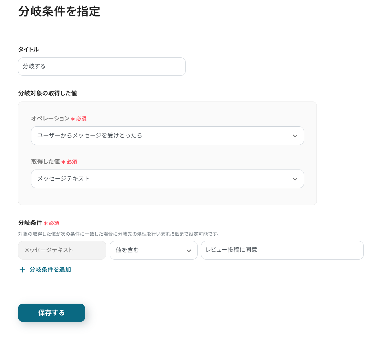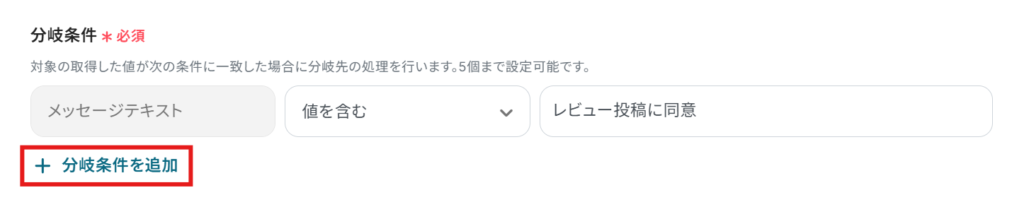 - 分岐機能では、どのような内容のメッセージを受信した際にフローを起動させるか、任意の分岐条件を設定してください