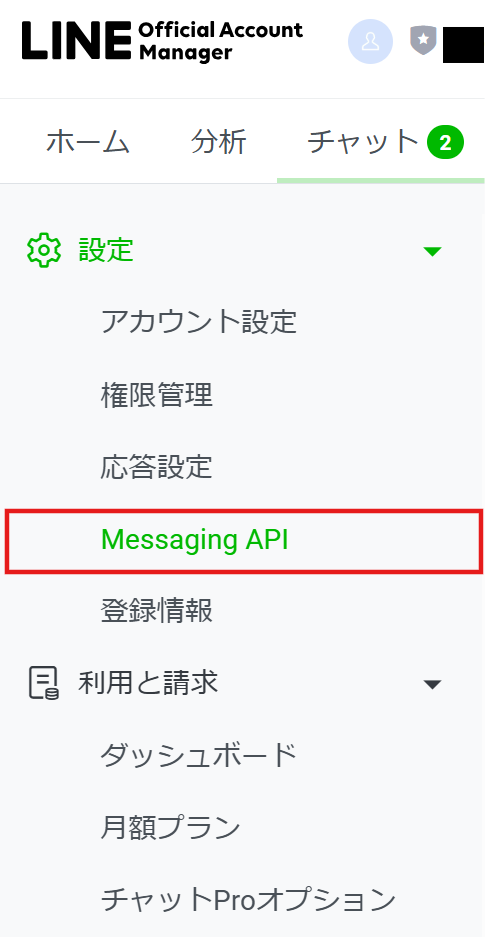 まずはLINE Developersコンソールにログインし、対象となるチャネルの管理ページを表示します。{メニュー内の「Messaging API」タブをクリックして設定画面に進みます。