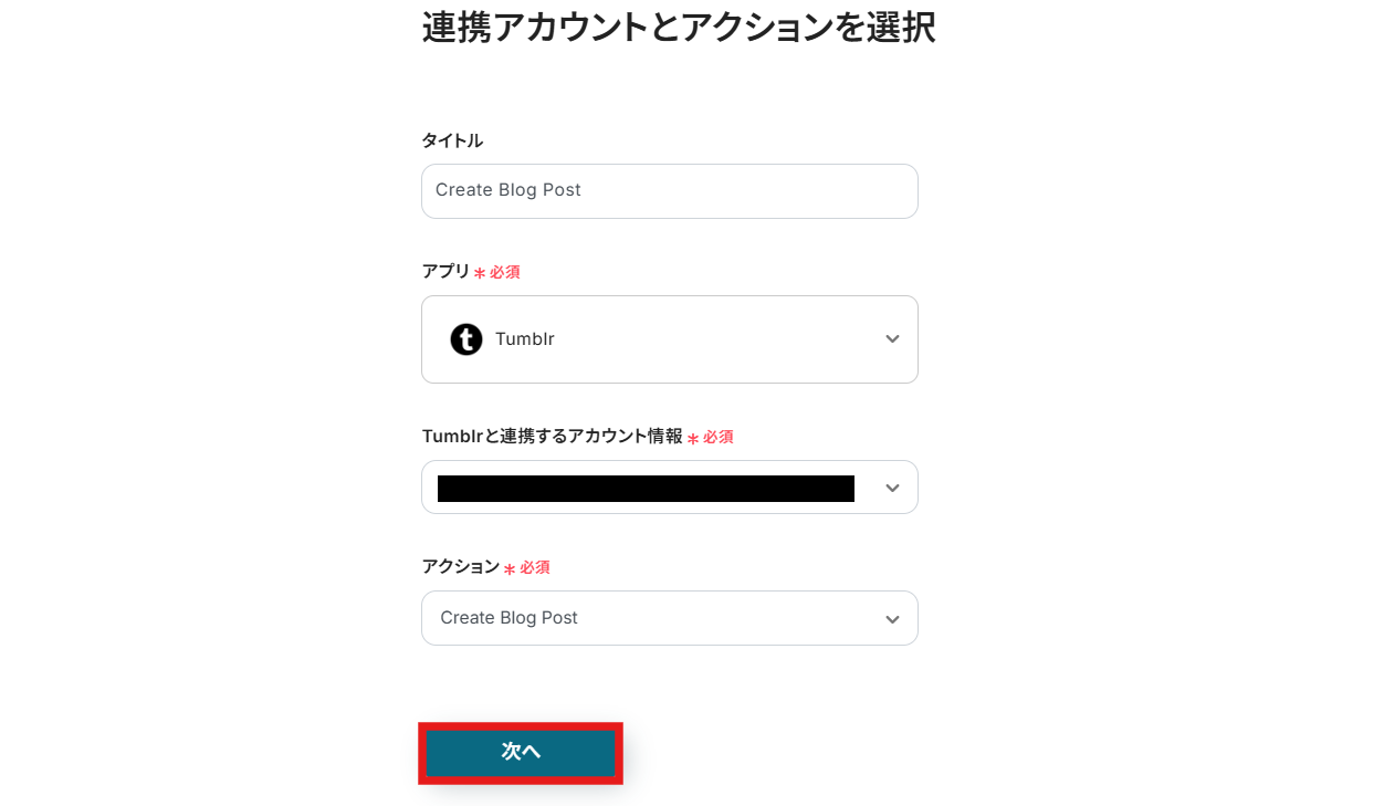 - 最後に、オペレーションでTumblrの「Create Blog Post」アクションを設定し、抽出したテキストを元にブログ投稿を作成します