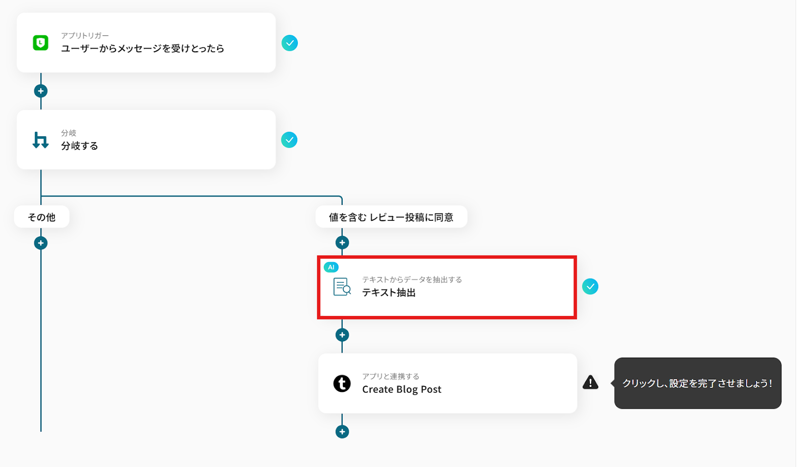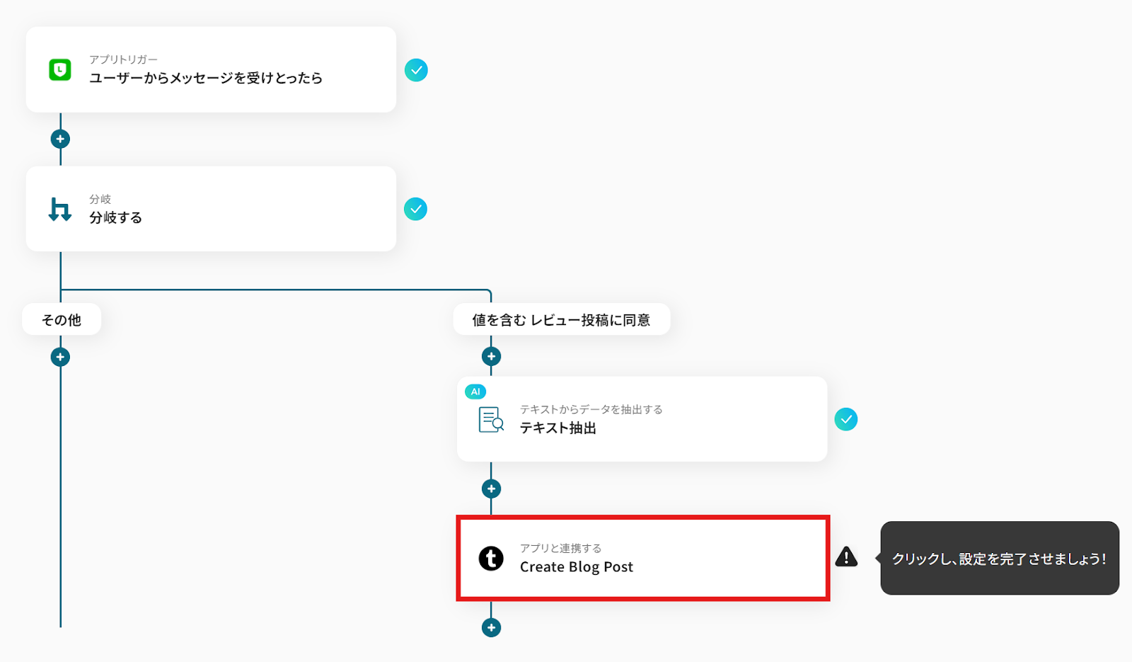 LINE公式アカウントに届いた特定のメッセージを、毎回手作業でコピーしてTumblrに投稿していませんか?この作業は手間がかかるだけでなく、投稿の遅延や漏れにつながることもあります。このワークフローを活用すれば、TumblrとLINE公式アカウントを連携させ、ユーザーからのメッセージ受信をきっかけに、AIがテキストを抽出してTumblrのブログ投稿を自動で作成するため、コンテンツ運用の効率を高めることが可能です。