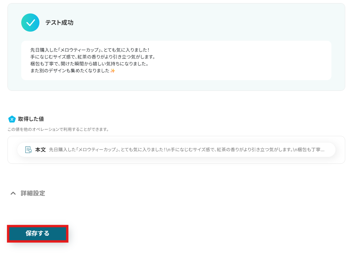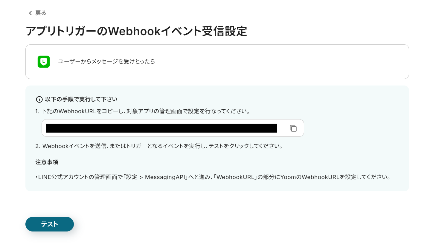 設定が終わったらYoomに戻り、テストをクリックしましょう。
