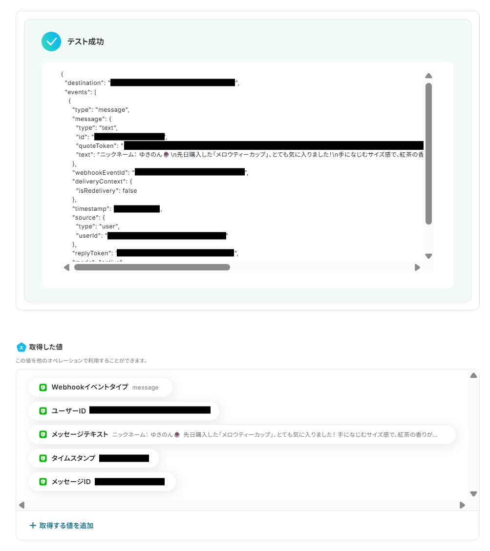 テストが成功すると、「テスト成功」という画面が表示され、LINE公式アカウントから取得した情報をYoomで引用できるようになります。