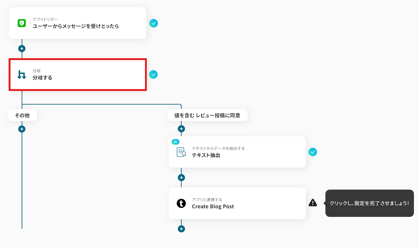 - LINE公式アカウントのトリガーの設定および分岐・AI・Tumblrのアクション設定