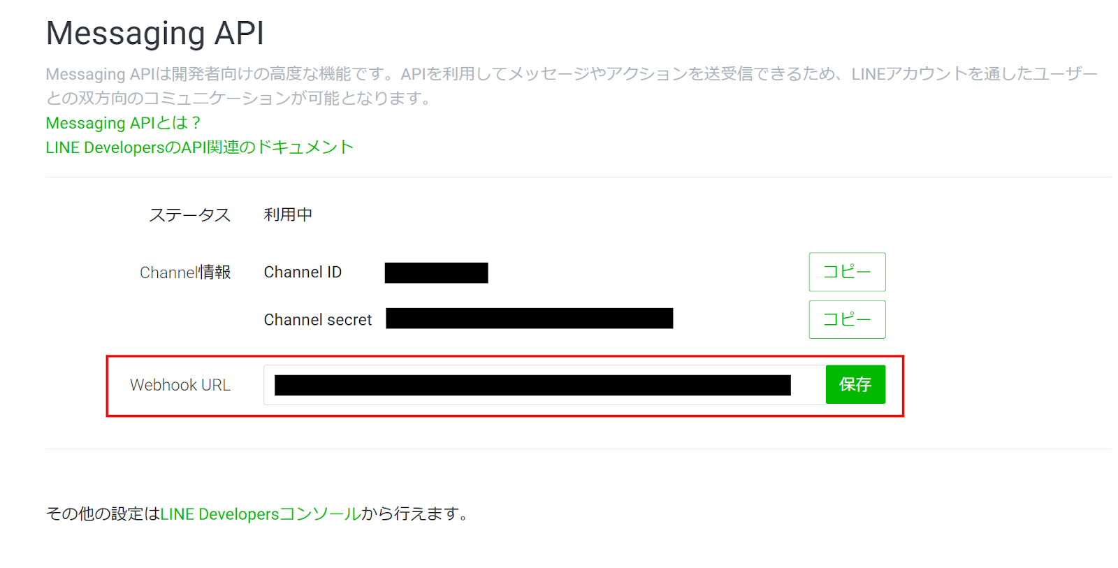Webhook URLをコピーした後、LINE公式アカウントの画面で設定を行います。