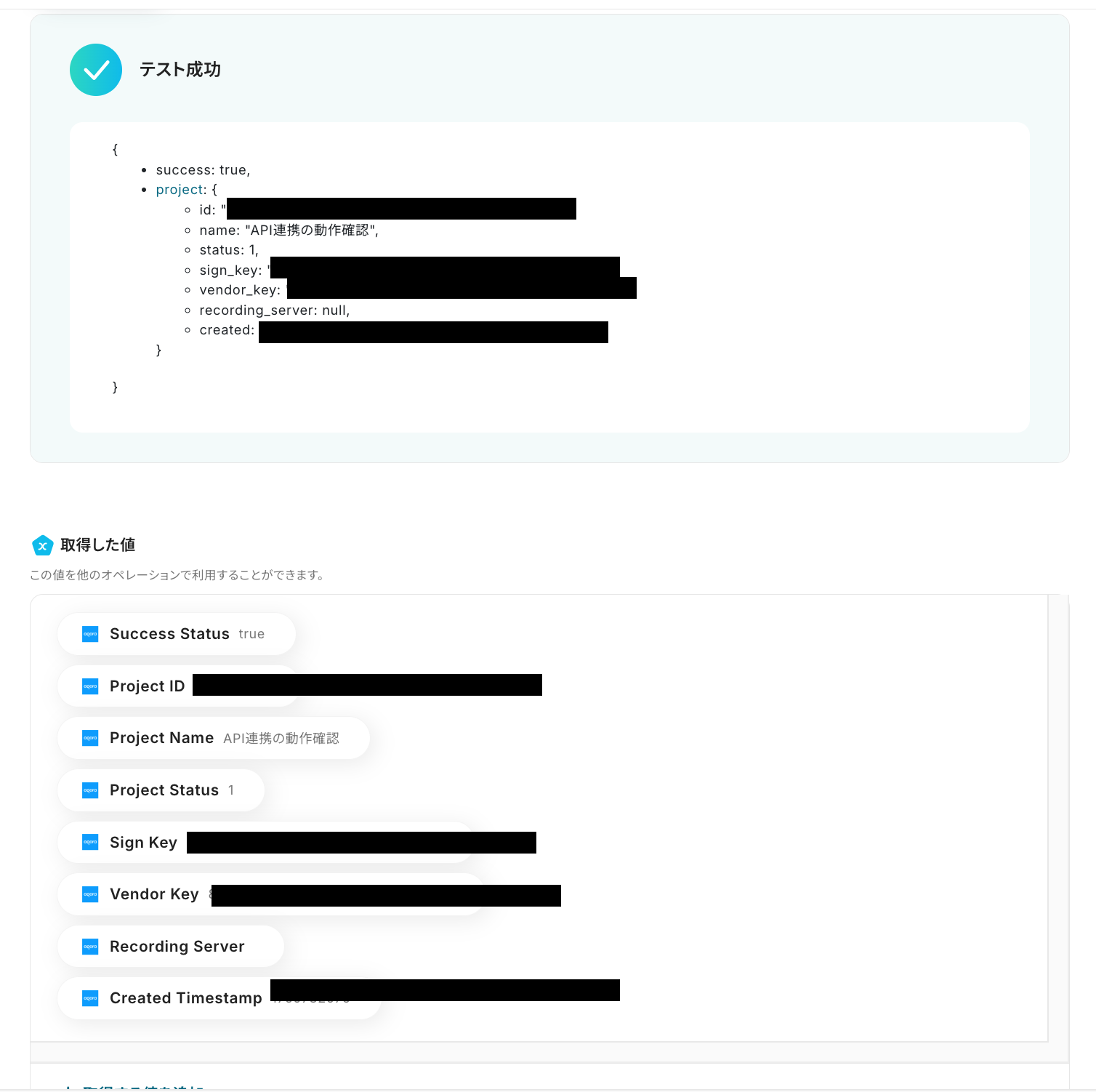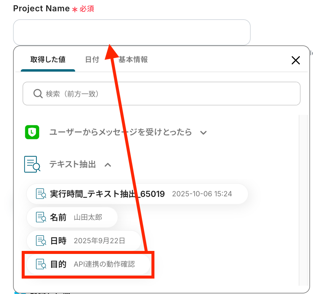 「Project Name」は、入力欄をクリックして表示される取得した値から選択してください。