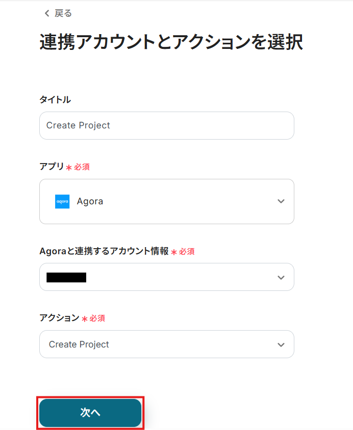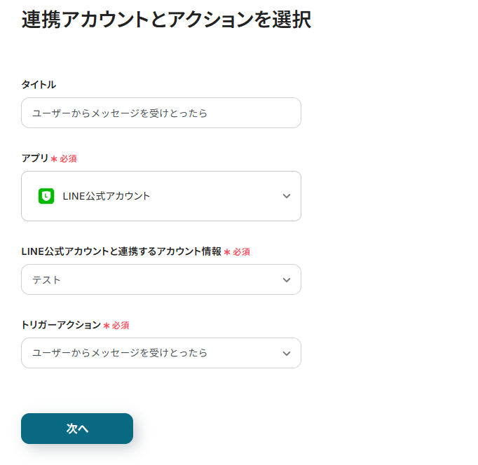 連携アカウントとアクションを選択する画面が表示されるので、今回連携するLINE公式アカウントのアカウントを確認し「次へ」をクリックします。