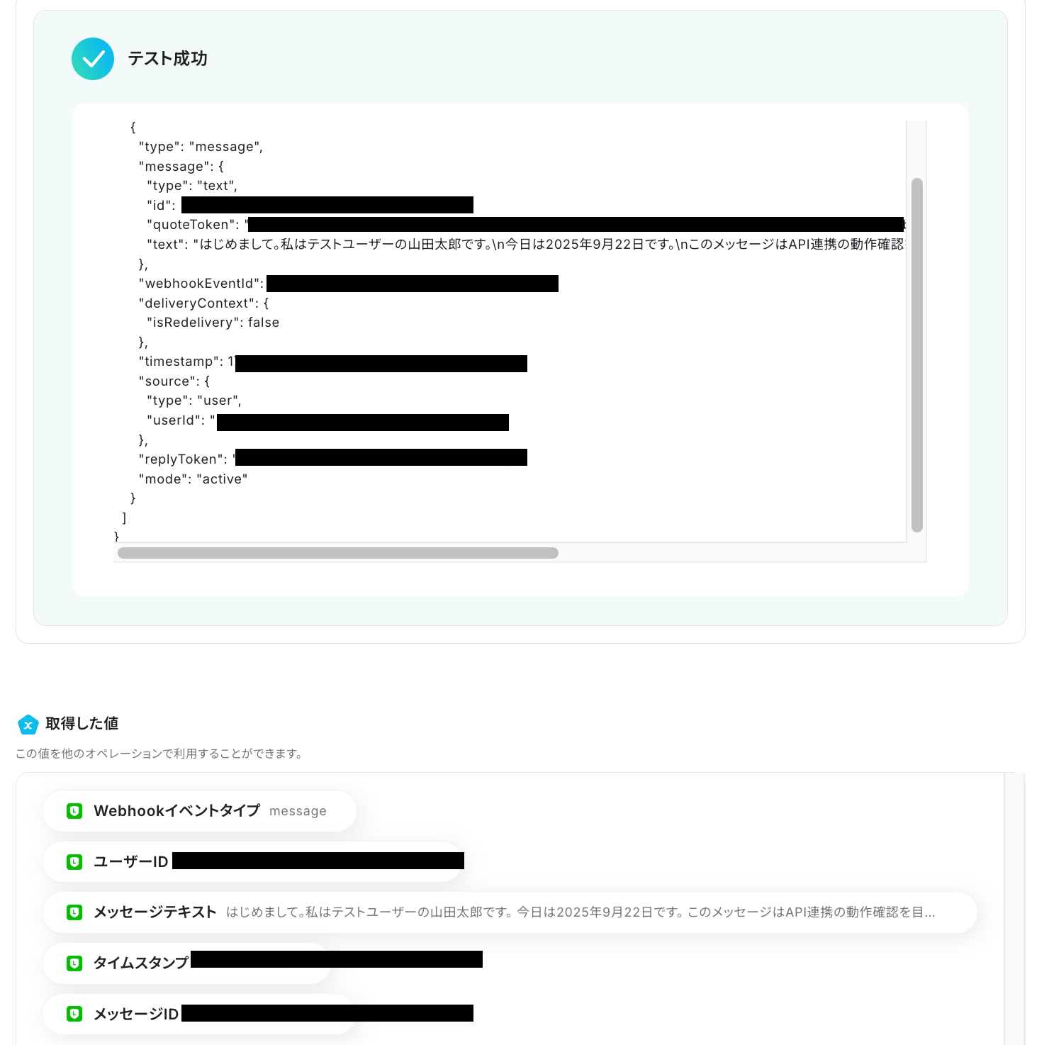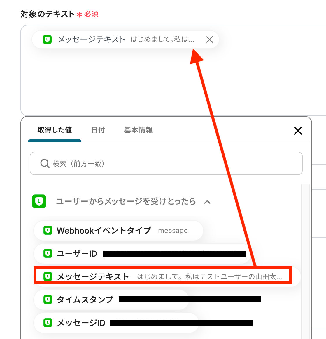 このように取得した値を活用して設定を行うことで、メッセージの本文を自動で取得し、抽出対象のテキストとして指定することが可能です。