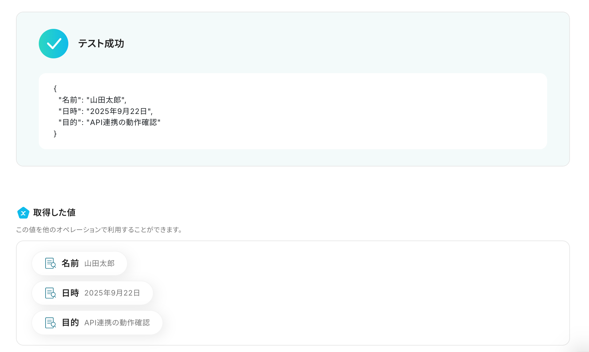 ここまで完了したらテストを実行しましょう。テストが成功すると、抽出した情報が取得した値に表示されます。