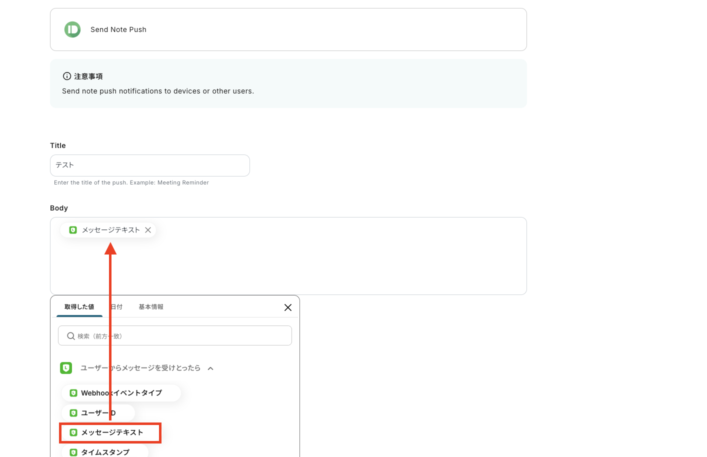 「Body」には、前ステップで取得した値(今回はシンプルに【メッセージテキスト】のみ)を引用していきましょう。