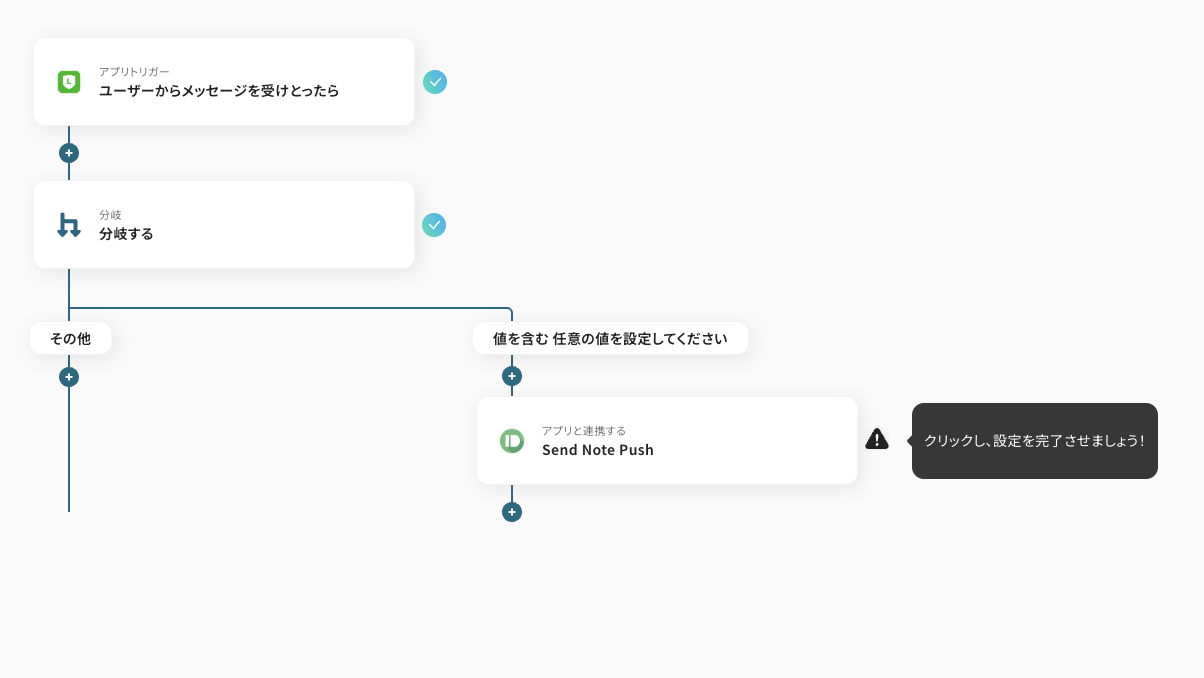 受信したメッセージの内容に応じて処理を分岐させる設定も可能なため、特定の条件に合致した場合にのみ通知を送るといった柔軟な運用を実現できます。