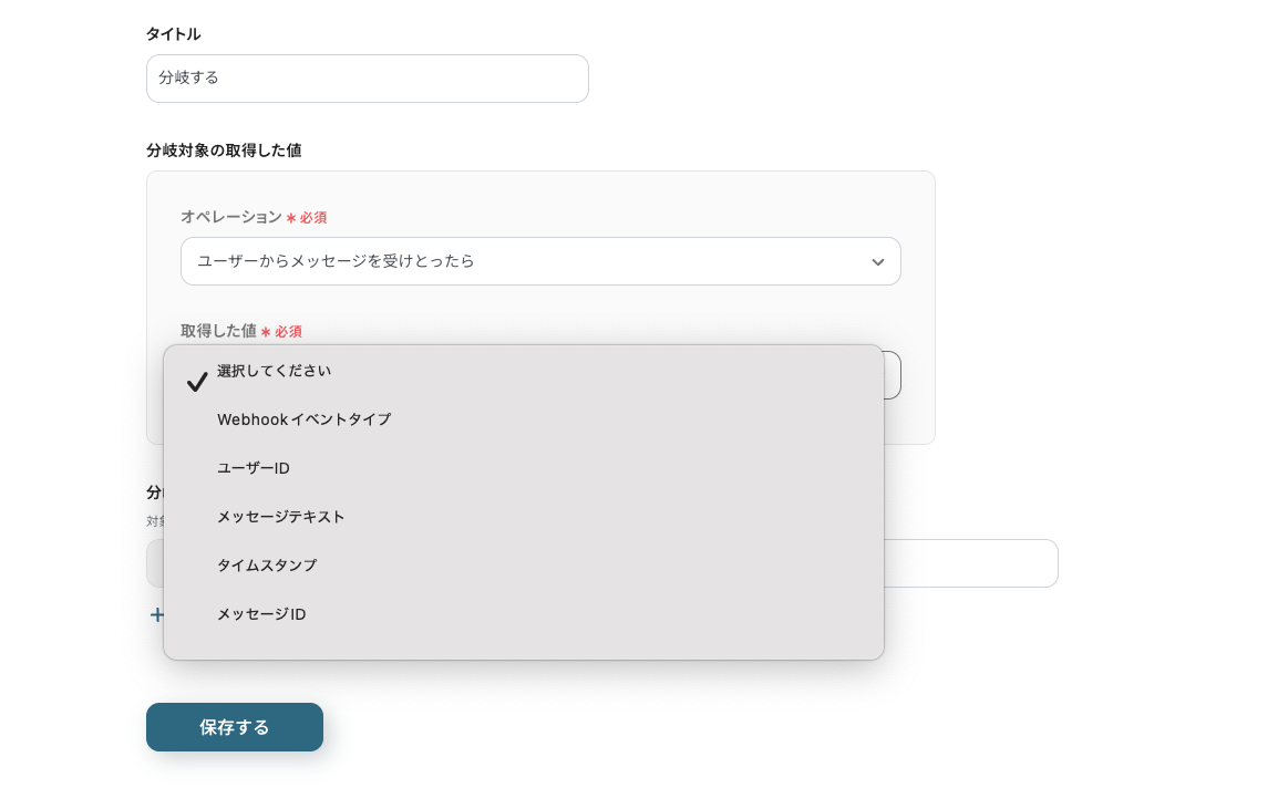 「分岐対象の取得した値」は、プルダウンから選択できます。今回は、トリガーのアクションを対象とします。
