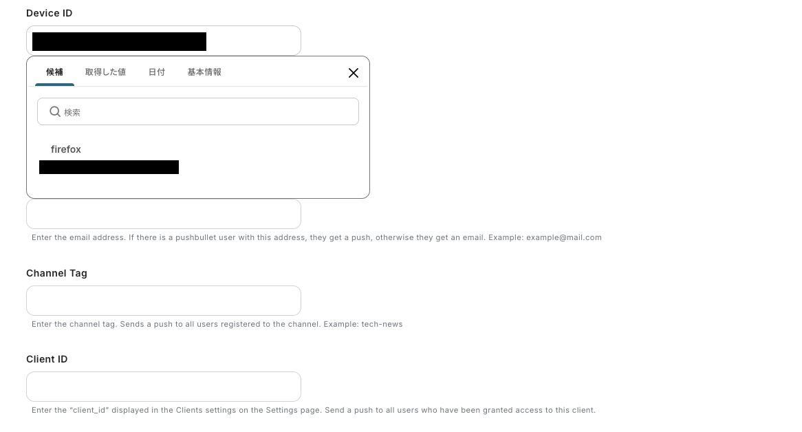「Device ID」は入力バーをクリックすると、連携したアカウントに基づいた情報が展開されます。『候補』から該当するものを選択してください。