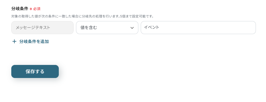 今回はテスト用として、メッセージテキスト内に【イベント】というキーワードが入っていると、後続アクションに進むように設定しました。