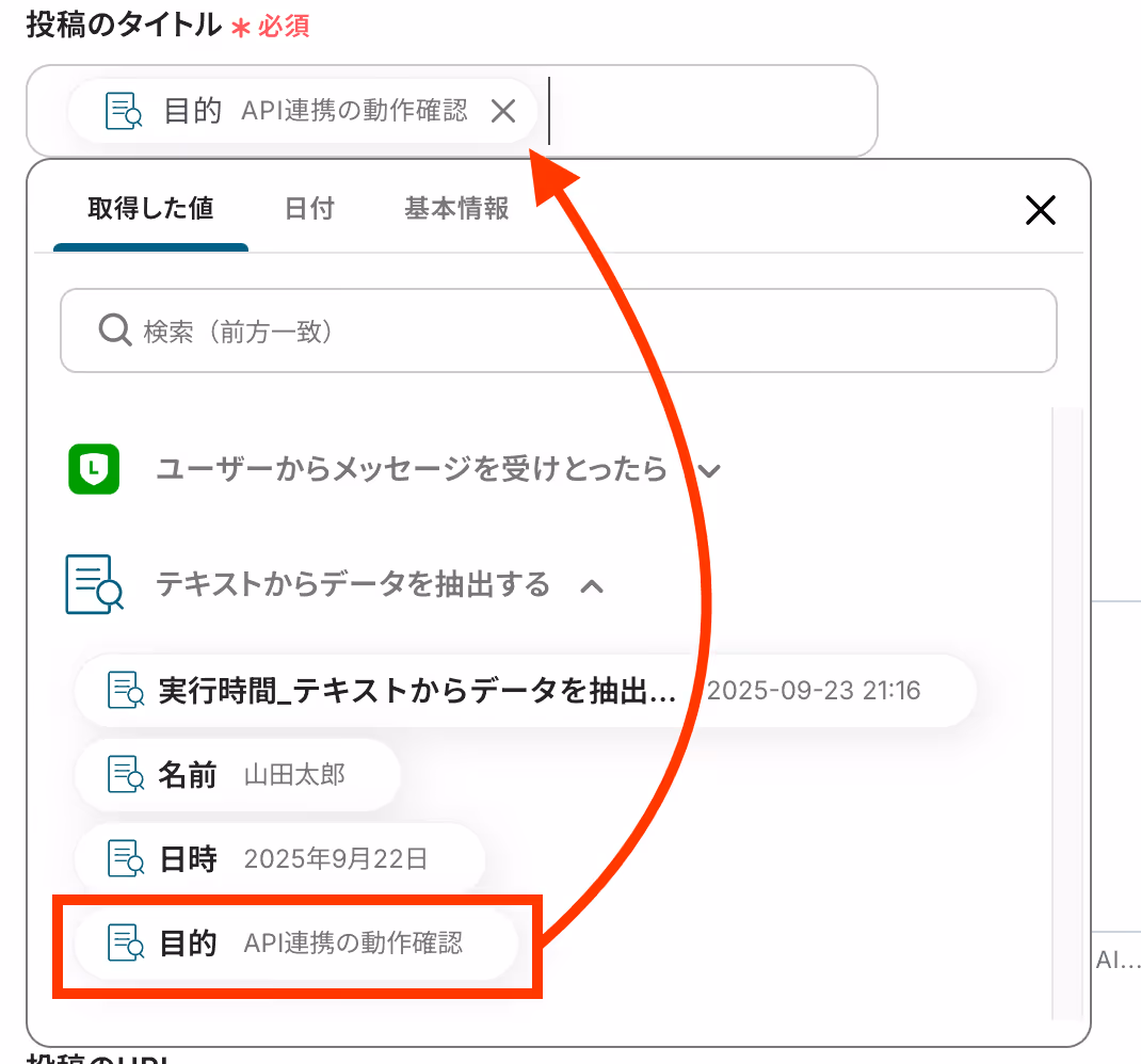 ※対象のテキストには、枠をクリックして表示される取得した値の「チャネルにメッセージが送信されたら」から抽出元になる値を設定します。これにより、投稿ごとに変わる値として反映できます。