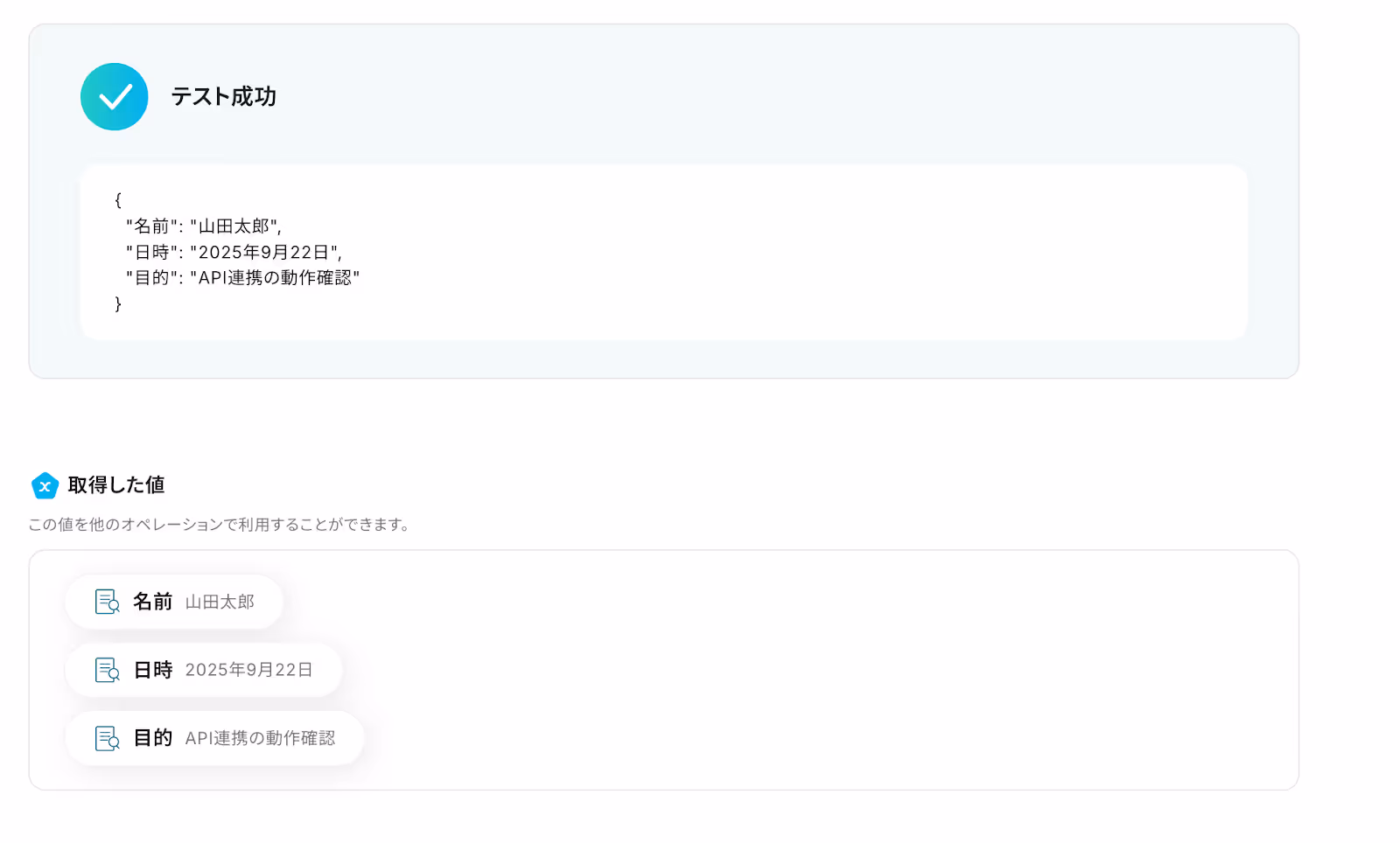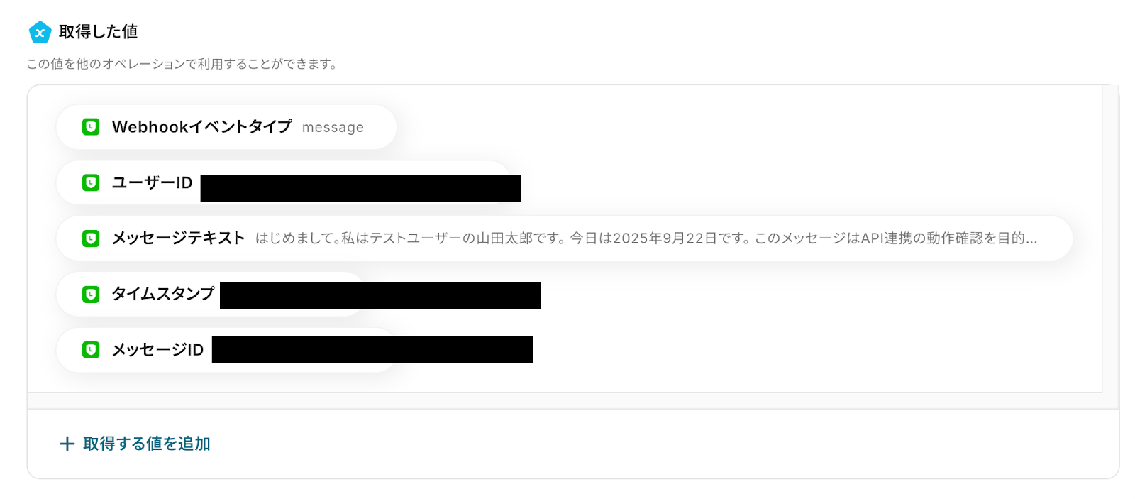 テストに成功すると、LINE公式アカウントで受信されたメッセージに関する情報が取得した値として表示されます。