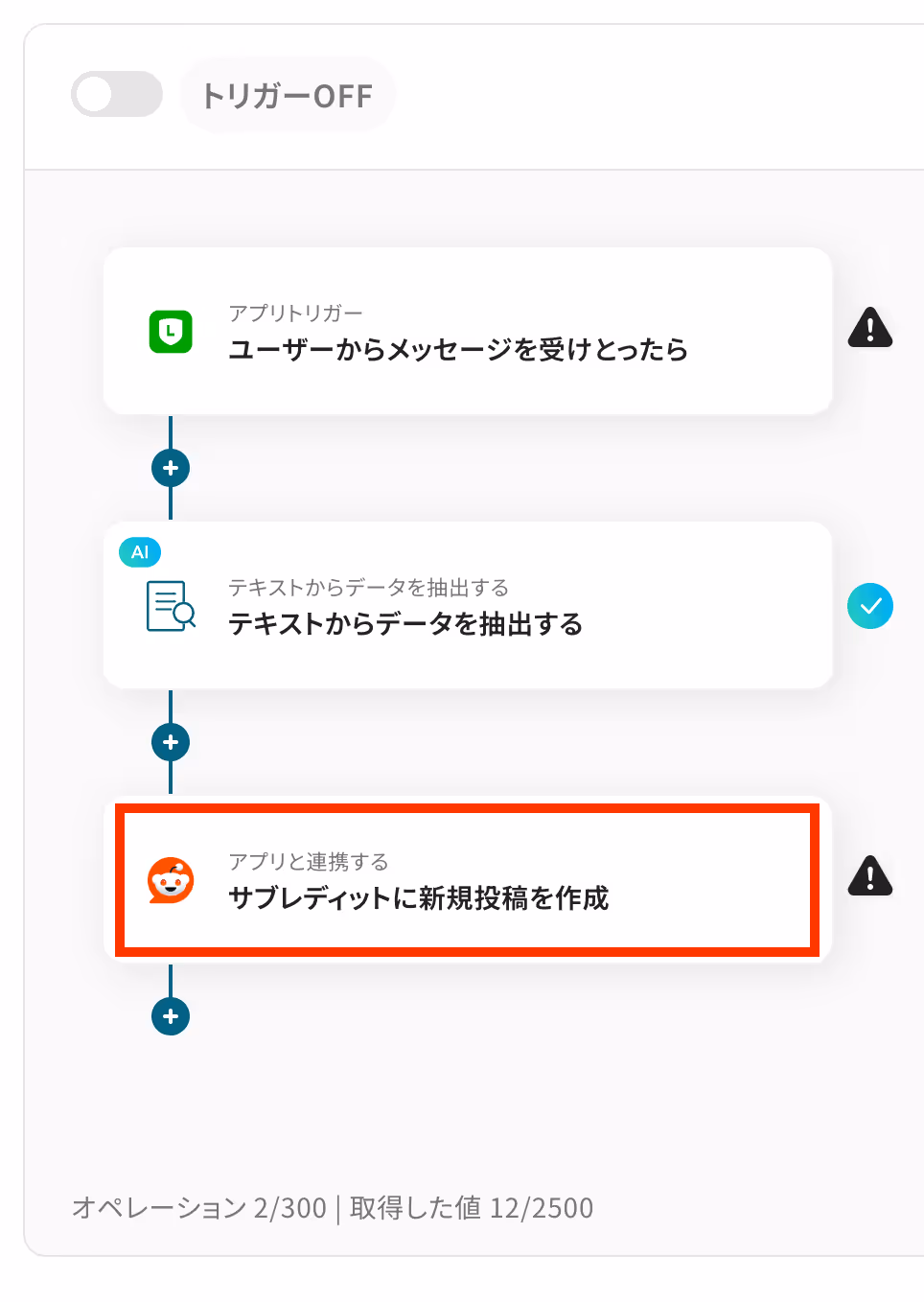 例えば、LINE公式アカウントに届いたユーザーからの重要なフィードバックを、瞬時にRedditの関連サブレディット(コミュニティ)に投稿して開発チームやサポートチームと共有するといったことが可能になり、業務の効率化に大きく貢献します。