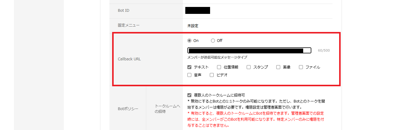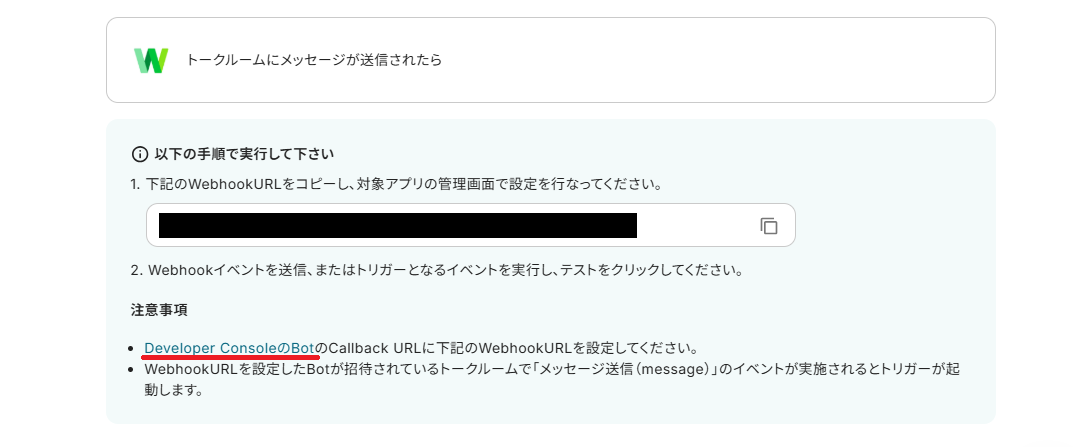 下記画面の注釈を確認し、WebhookURLをコピーしたらDeveloper ConsoleのBotのページを開き、設定を行います。