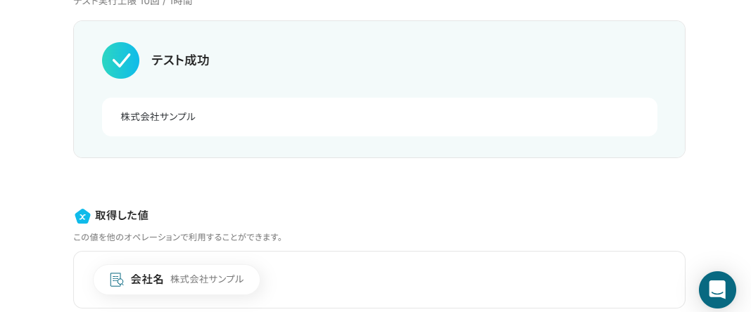 テストを実行し、成功すると抽出した情報が取得した値(アウトプット)に表示されます。