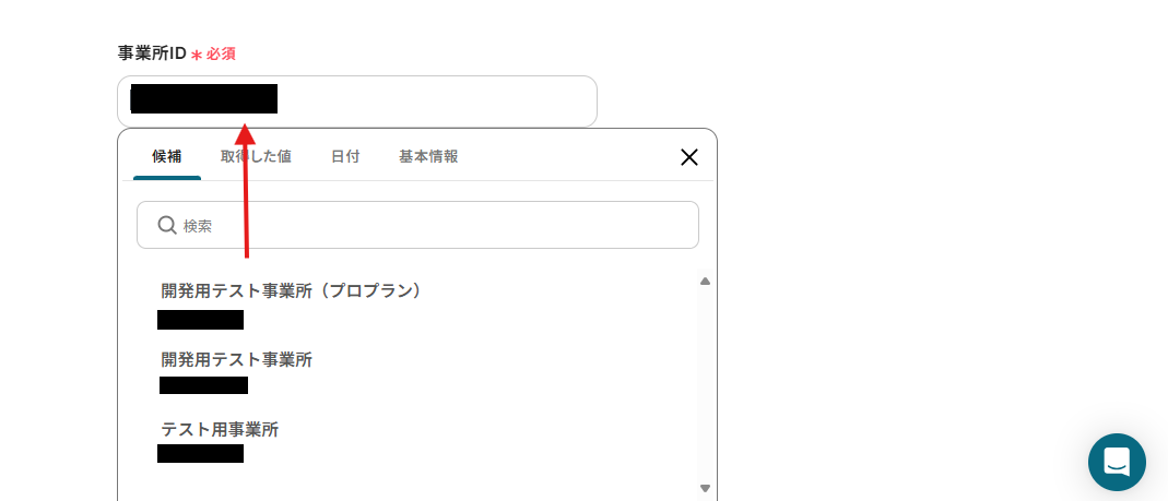 事業者IDは、枠内をクリックし表示される候補から任意で選択してください。