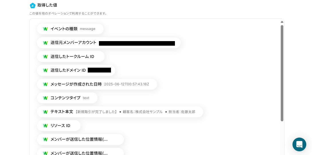 テストが成功すると先ほどLINE WORKSのBotに投稿した情報が取得した値(アウトプット)に表示されます。