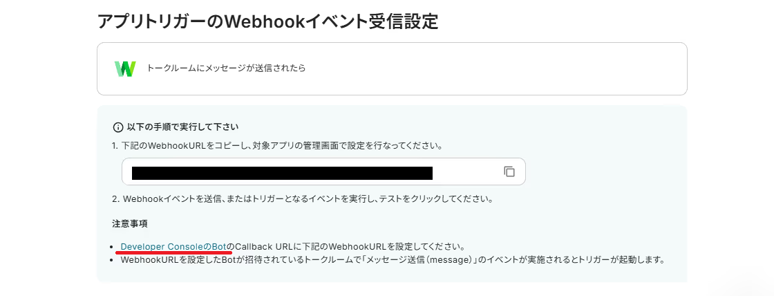 次のページで、Webhookイベント受信設定を行います。 WebhookURLをコピーしたら、下記画面の赤線部分をクリックしましょう。