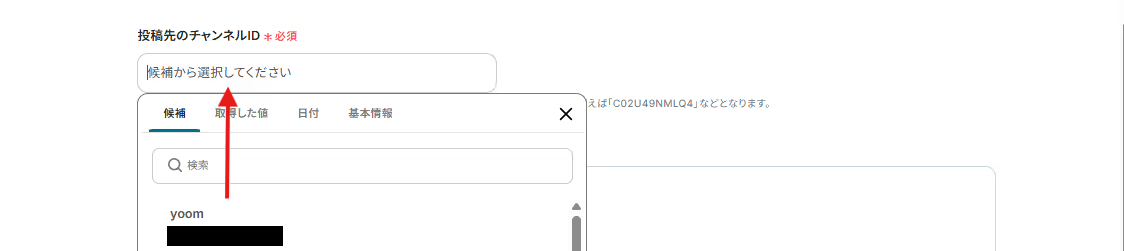 投稿先のチャンネルIDは、枠内をクリックし表示される候補から任意で選択してください。
