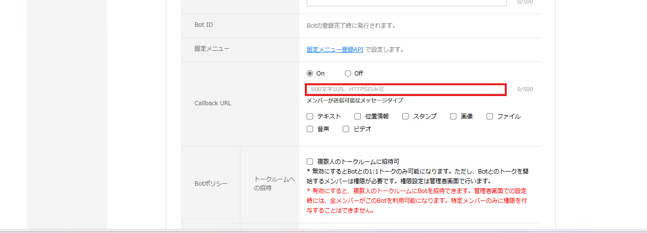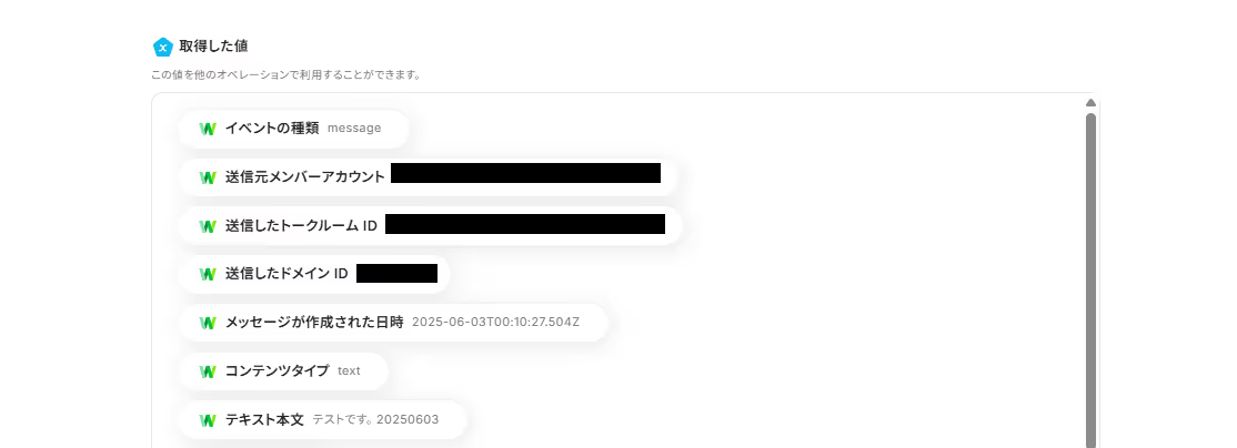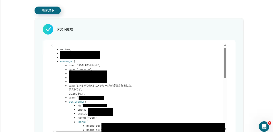 ここまで設定できたら、WebhookURLを設定したLINE WORKSのボットにメッセージを送信します。 テスト用なので、メッセージ内容は自由に設定してOKです! 詳しい設定方法は、「LINE WORKS(API2.0)のCallback設定方法について 」をご参照ください。 先ほどのYoomの画面に戻り、画面下部の「テスト」ボタンをクリックします。 テストが成功するとLINE WORKSに送信したメッセージの情報が取得した値 に表示されるので、正しく取得されているのを確認できたら「保存する」ボタンを押してください。