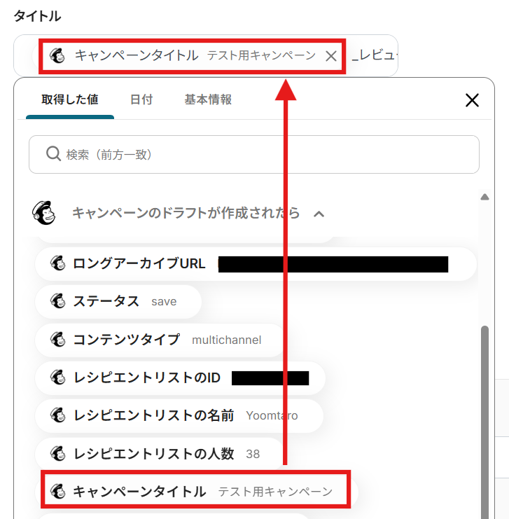 「キャンペーンタイトル」+「キャンペーンID」など取得した値同士の組み合わせや、今回のテストのように手動入力などを組み合わせて設定することもできます。