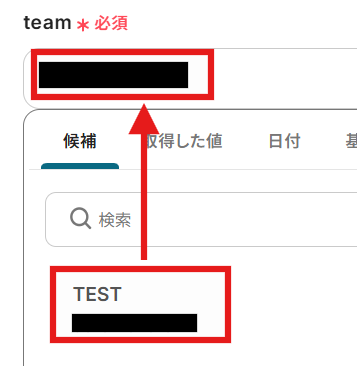 「team」「space」「folder」「list_id」まで、それぞれ入力欄をクリックすると表示される選択肢から選びましょう。