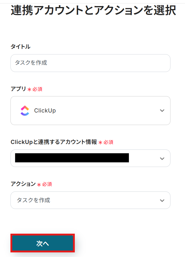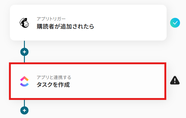 次に、取得した購読者の情報から、ClickUpに新しくタスクを作成するアクションの設定を進めていきます。