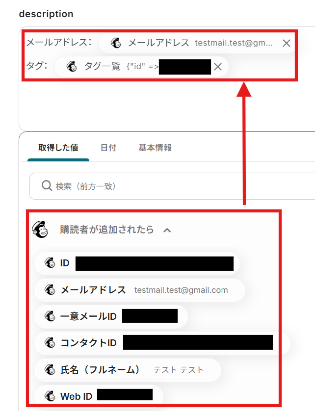 「description」には、ClickUpに登録したい任意の項目を、先ほどの「購読者が追加されたら」で取得した値の中から選択してください。