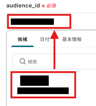 audience_idは、入力欄をクリックすると選択肢が表示されますので、候補の中から選びましょう。