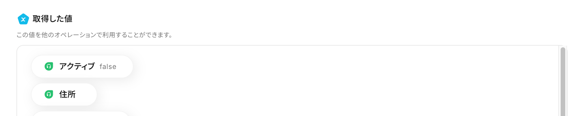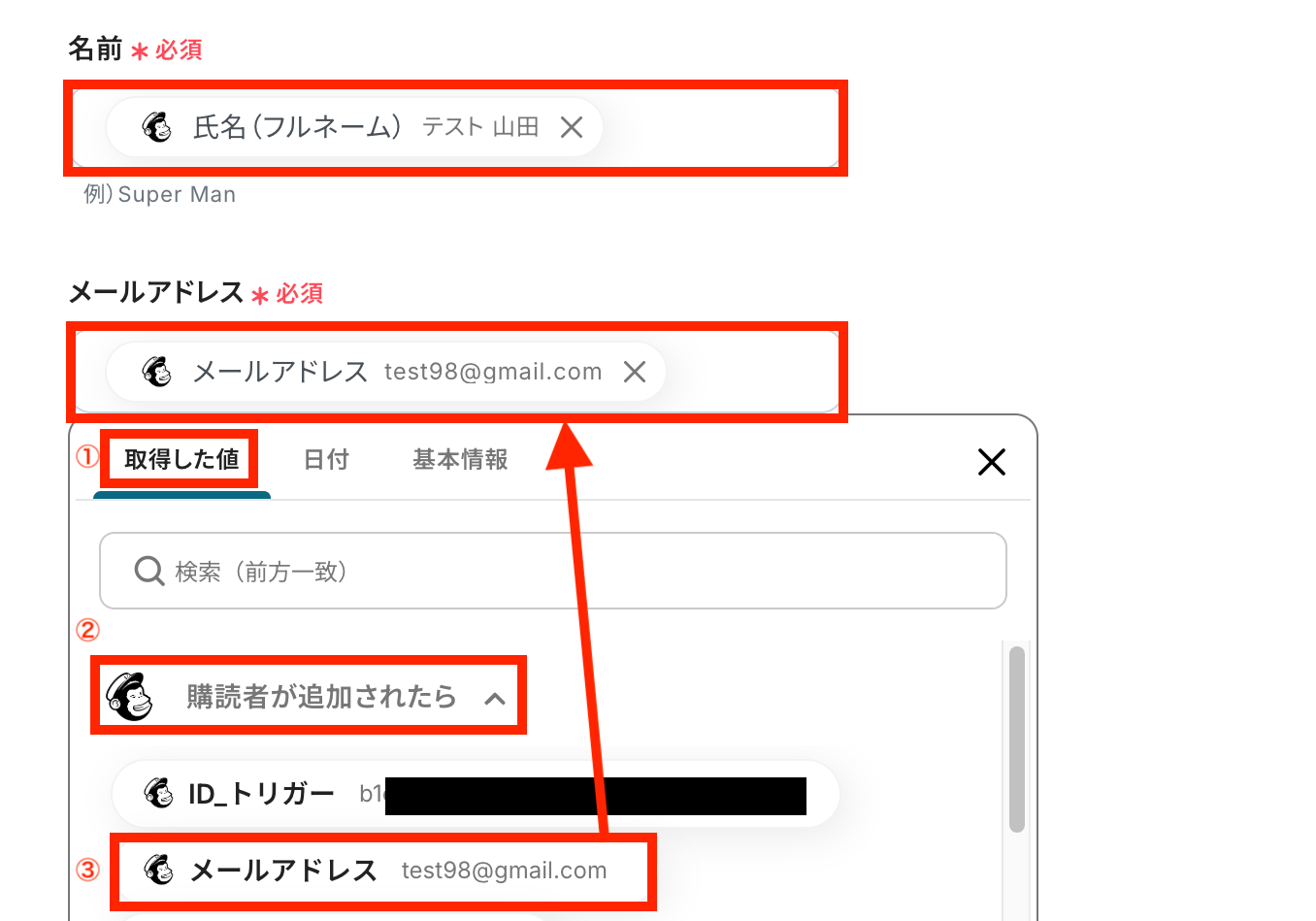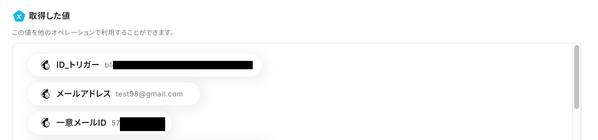 テストに成功すると「取得した値」としてMailchimpに登録した購読者のデータがアウトプットされます。