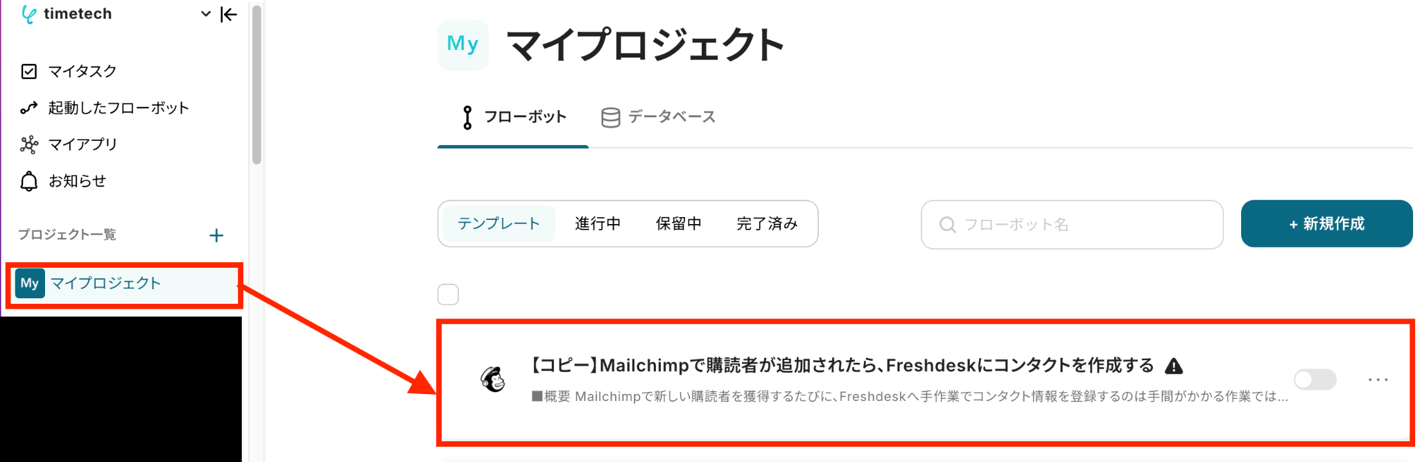 左側にあるメニューの「マイプロジェクト」から、コピーしたテンプレートを開きます。