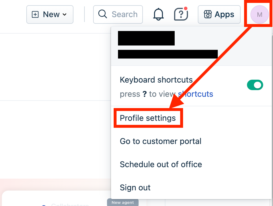 「APIキー」の取得方法は、Freshdesk画面の右上のアイコンをクリックして「Profile settings」を押します。