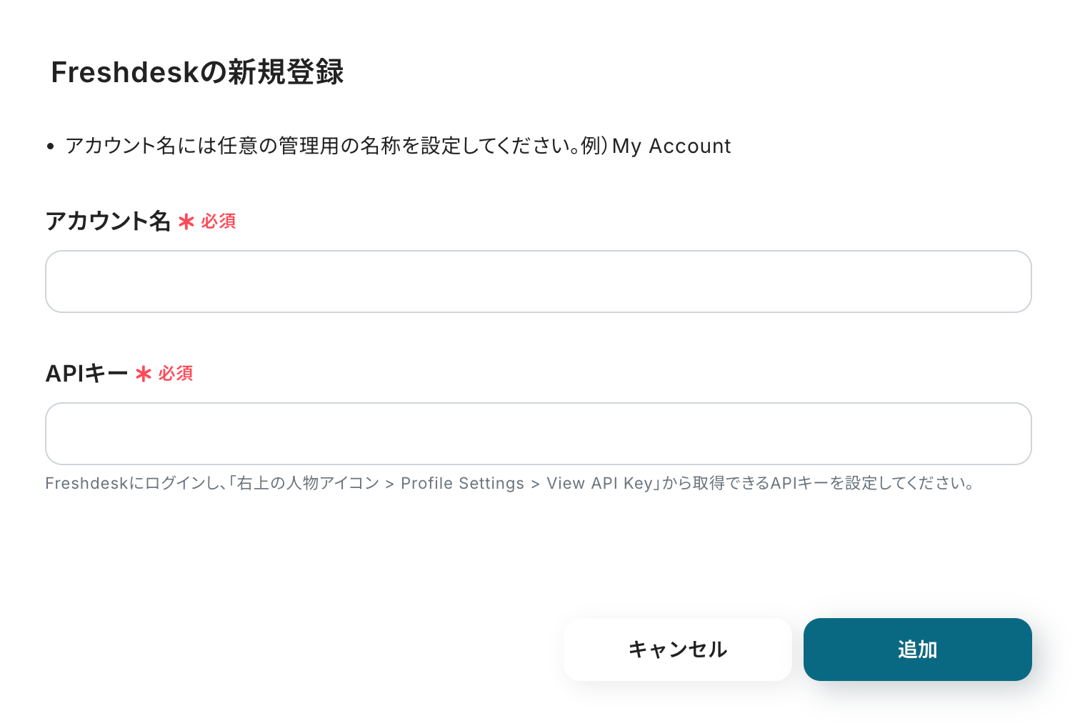 赤枠部分の説明文を確認しながら「アカウント名」「API Key」「サーバードメイン」を入力して「追加」をクリックしたら連携完了です!