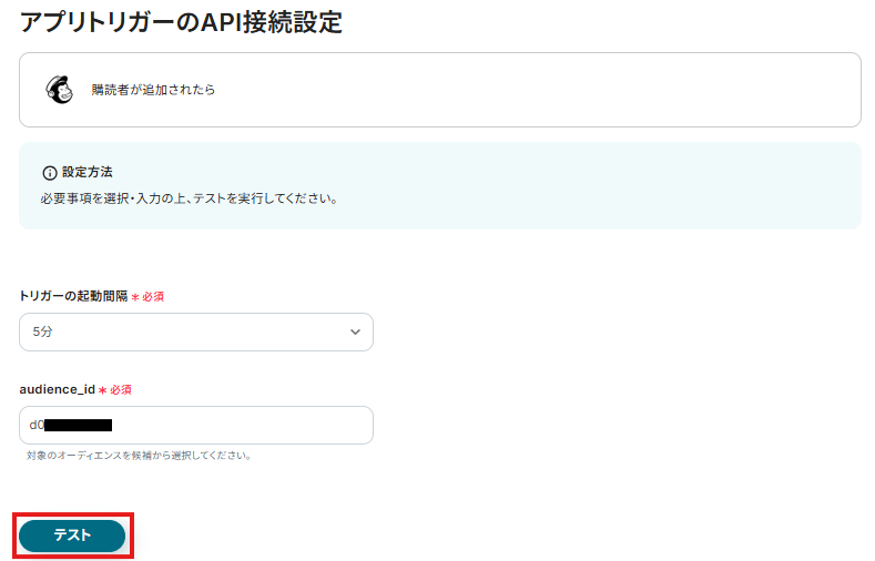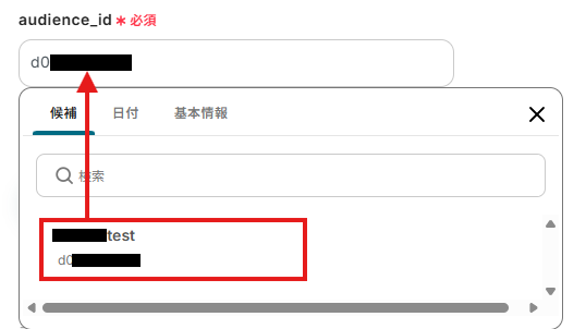 オーディエンスID:候補から使用するMailchimpのオーディエンスを選択します