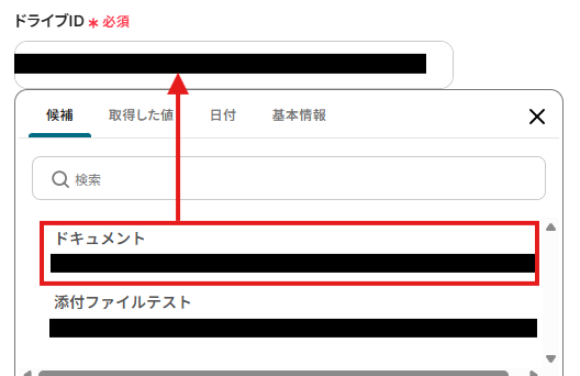 ドライブID:候補からMicrosoft SharePointの使用するドライブを選択します