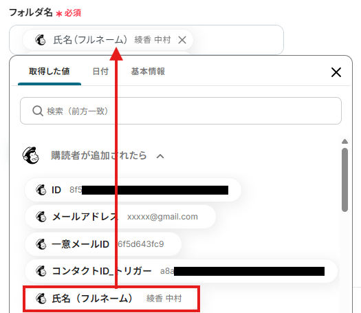 フォルダ名:「購読者が追加されたら」のプルダウンを開いて「氏名(フルネーム)」を選択します。 取得した値を活用することで、固定値ではなく、トリガーが実行されるたびに最新の情報が反映できます。